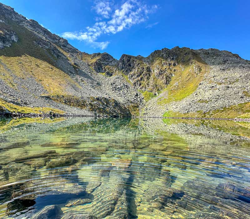 В четвертый день похода собираем лагерь и идем через перевал Кёльауш мимо озера Верхняя запятая, которое находится на высоте 2800 м над уровнем моря. Вода в озере голубая, прозрачная и очень холодная и даже летом в ней могут плавать льдины.
